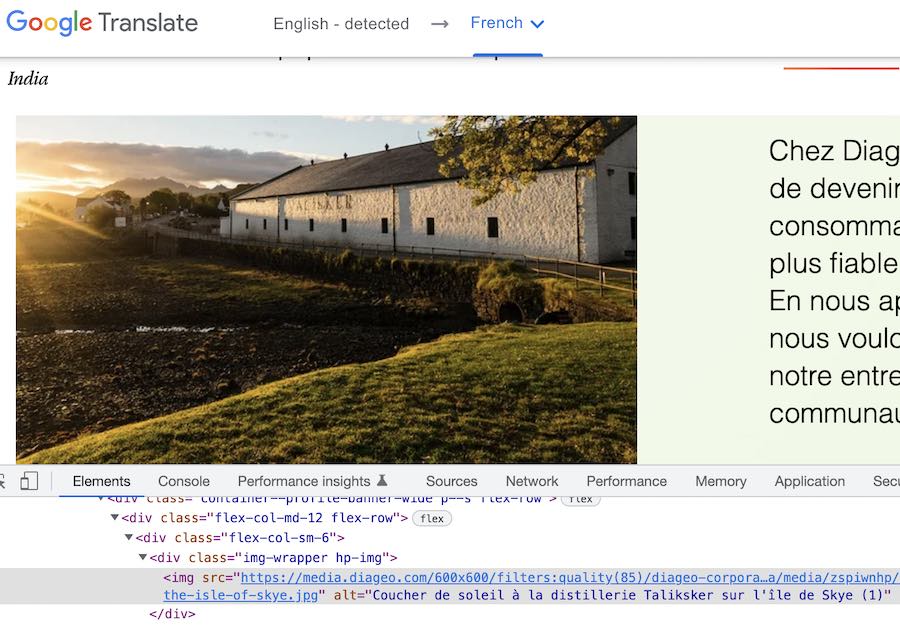 Originally in English, the service has translated the page into French. We can see that the text in the image element's alt attribute has also been translated into French.