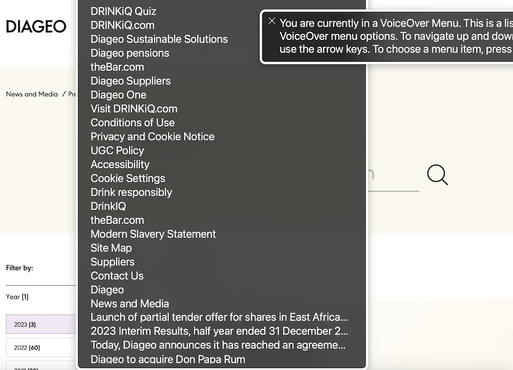 A list of links presented by a screen reader. The text from each link is read without any context from where it appears on the webpage.