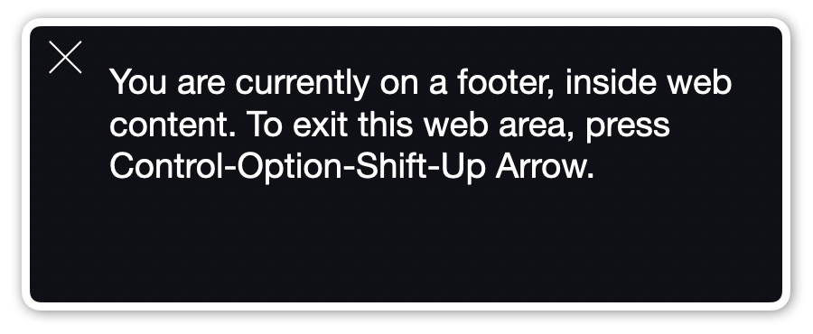 VoiceOver announces that the user has moved the screen reader cursor into a footer region: "You are currently on a footer, inside web content. To exit this web area, press Control-Option-Shift-Up Arrow."