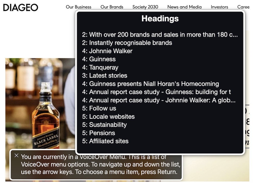 Notice that the VoiceOver menu crops any headings which are over about 50 characters in length, so it's useful to front-load your heading content so that the most specific and relevant text is near the beginning.