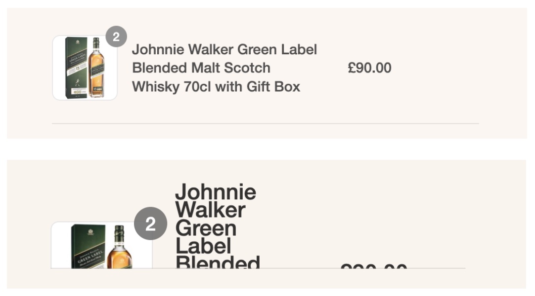 An example of inaccessible text in a shopping cart that has become unreadable when resized to 160%. Most of the visible details of the purchase are clipped when they overflow their fixed-size container element.